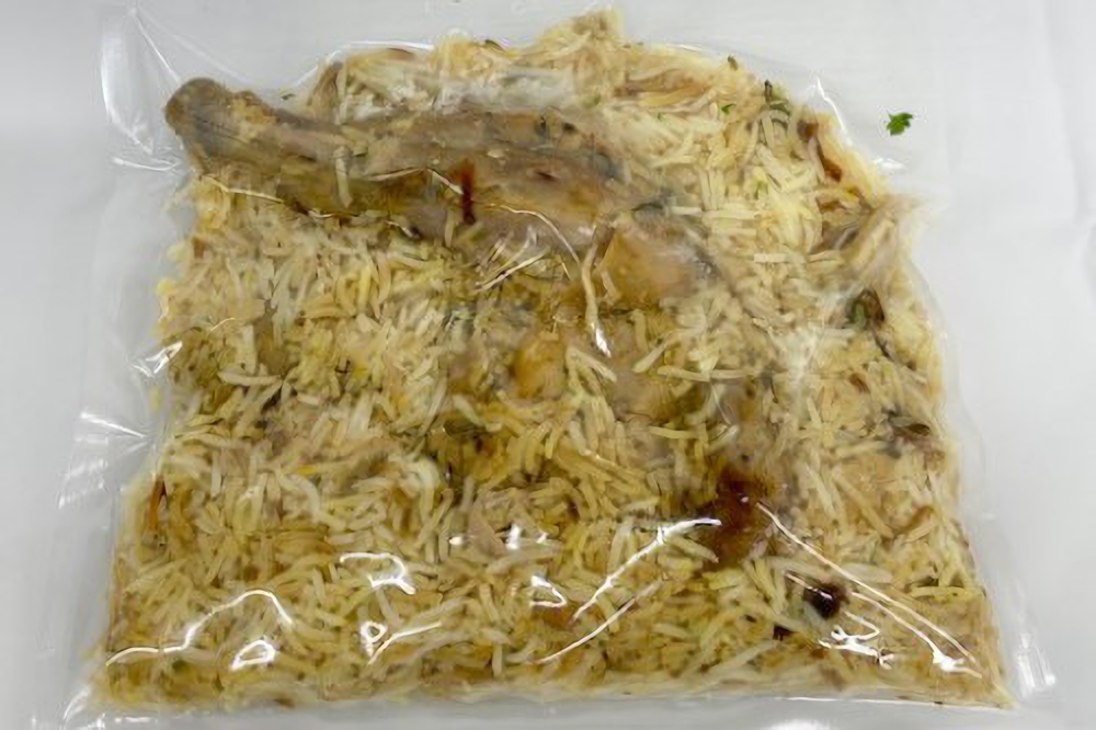 原材料名:鶏肉(華味鳥、福岡県産)、バスマティライス(インディアゲートクラシック)、玉ねぎ、ヨーグルト、植物油、ローズウォーター、レモン果汁、ギー、青唐辛子、香辛料、塩(内モンゴルの湖塩)、パクチー、スペアミント、キビ糖